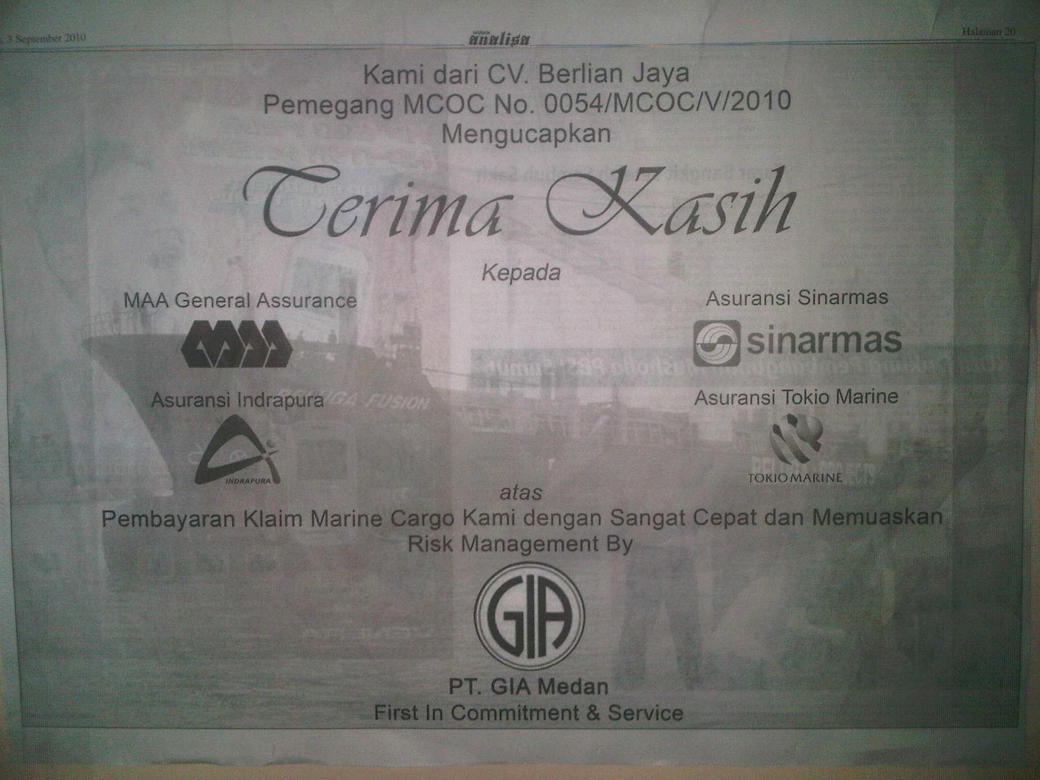 dan di RISK MANAGEMENT BY: PT. GIA MEDAN atas pembayaran klaim Marine Cargo dari asuransi ke customer CV. BERLIAN JAYA dengan sangat cepat dan memuaskan.