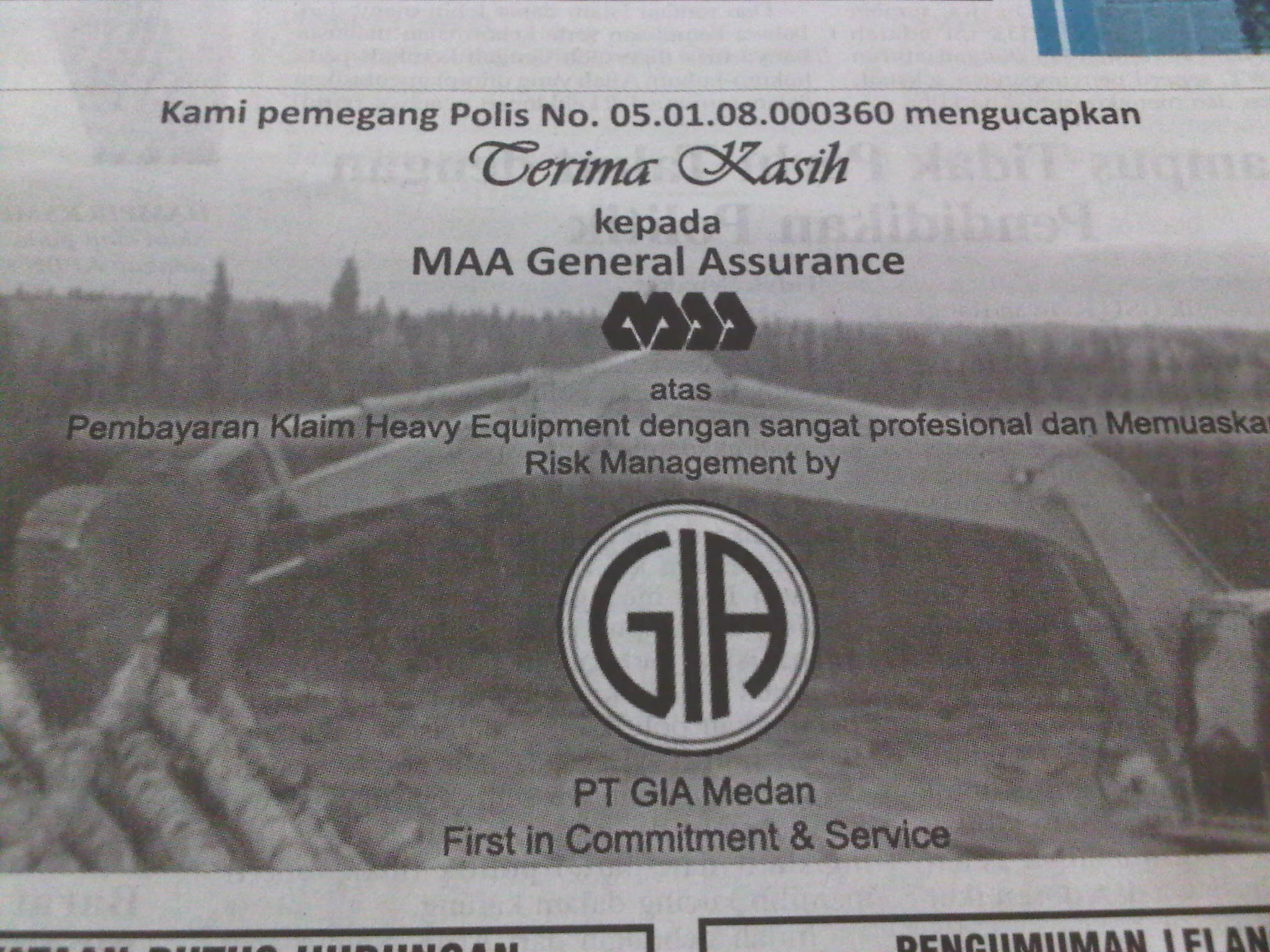 Pada tanggal 20 September 2010, surat kabar Bisnis Indonesia menerbitkan ucapan Terima Kasih kepada MAA General Assurance, Asuransi Sinarmas, Asuransi Indrapura, dan Asuransi Tokio Marine, yang di di Risk Management oleh PT. GIA Medan atas pembayaran klaim Marine Cargo dari asuransi ke customer CV. BERLIAN JAYA dengan sangat cepat dan memuaskan.