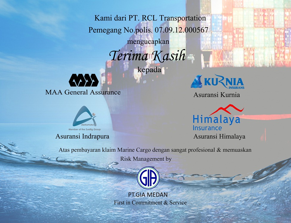 Ucapan Terima Kasih PT RCL Transportation kepada MAA General Assurance, Asuransi Indrapura, Asuransi Kurnia, Asuransi Himalaya Pelindung atas pembayaran klaim yang cepat, profesional dan memuaskan.